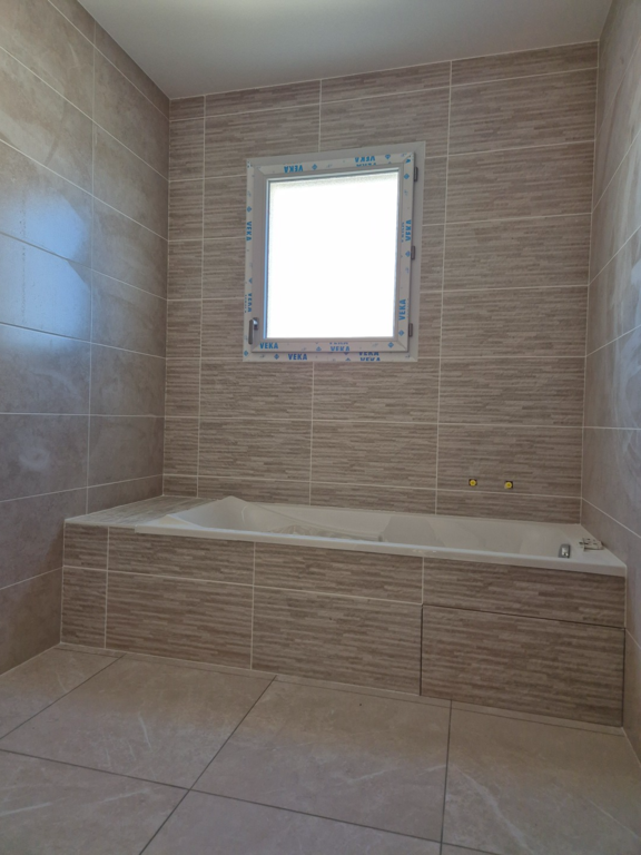 - SDB entièrement équipée avec faïence meuble double vasque, douche, baignoire et sèche serviette